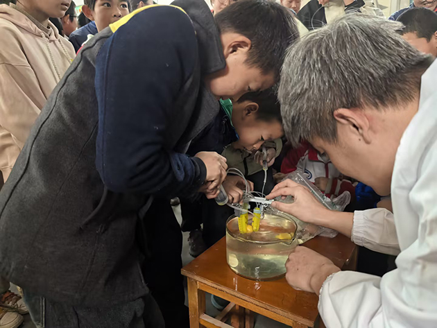 活動(dòng)還精心策劃了兩場(chǎng)研究所前沿科學(xué)成果互動(dòng)實(shí)驗(yàn),成為了點(diǎn)燃同學(xué)們科學(xué)熱情的“催化劑”。在“摩擦‘造’星光”實(shí)驗(yàn)中,隨著材料的摩擦、擠壓和拉伸,綻放出一道道絢麗的光芒,同學(xué)們瞪大雙眼,臉上寫(xiě)滿了興奮與好奇。在“水凝膠仿生章魚(yú)觸手抓取器”實(shí)驗(yàn)里,當(dāng)柔軟的水凝膠抓手精準(zhǔn)抓起漂浮的蛋黃和豆腐時(shí),現(xiàn)場(chǎng)響起陣陣驚嘆。實(shí)驗(yàn)結(jié)束后,同學(xué)們圍在科研人員身邊說(shuō),“原來(lái)科學(xué)這么有趣!”“以前覺(jué)得科學(xué)離我們很遠(yuǎn),現(xiàn)在才發(fā)現(xiàn),科學(xué)藏在生活的每一個(gè)細(xì)節(jié)里?!?